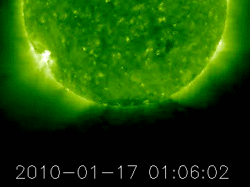 Y la última de estas demostraciones del poder del Sol se produjo el pasado 19 de Enero en una región fuera de la vista directa desde la Tierra, pero no de uno de los dos gemelos STEREO, cuya posición orbital le permite observar zonas invisibles para nosotros..ese día.una fuerte erupción se hizo visible ante los ojos de esta sonda, una de intensidad notable y la mayor registrada en los dos últimos años. No fue la única, y desde el grupo de manchas solares 1039, fuente de esta actividad explosiva, y desde el 17 de Enero se registraron hasta un total de tres erupciones, siendo la que protagoniza esta noticia posiblemente la más potente de todas ellas.