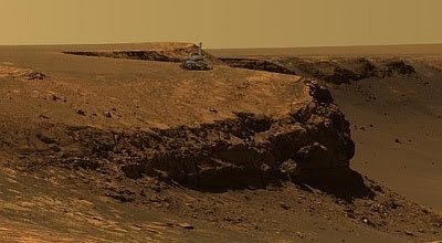 A principios de 2006 Opportunity se asomo al borde del cráter Victoria, cuya exploración le mantenría ocupado dos años y que terminó en Agosto de 2008, cuando inició su actual camino hacia Endeavour. Durante su estancia también se hicieron composiciones especials donde se añadían a panorámicas reales añadidos imaginarios para ayudar a comprender mejor las dimensiones de todo lo que estábamos viendo. Este es el caso de la imagen superior, que muestra a un falso pero a escala real Opportunity sobre una de las formaciones que dan forma a Victoria, el llamado "Cabo Verde".Gorgeous 3 D Vistas of Martian Crater and Hydrate Minerals at Santa Maria