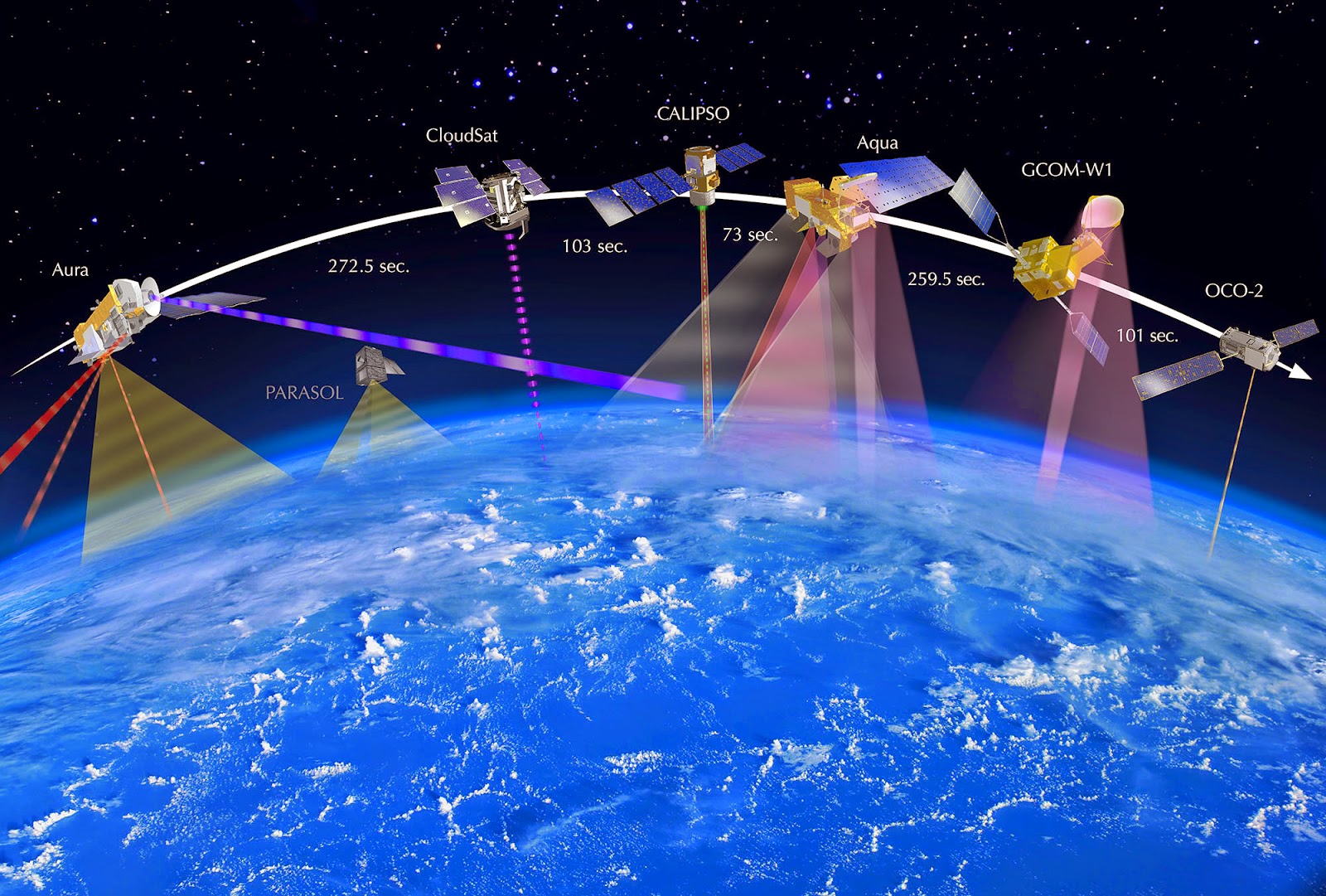 Pero no lo hará solo. Cada día, por encima de nuestro planeta, 5 satélites de observación terrestre se desplazan como si fueran los vagones de un tren, uno detrás de otro, separados por minutos, en ocasiones solo por segundos. Llevan en conjunto 15 instrumentos científicos, cada uno de ellos orientados a aspectos diferentes de nuestro planeta, funcionando como una herramienta unida y potente que busca avanzar en nuestra comprensión de la superficie y la atmósfera de La Tierra, no tan conocida como en ocasiones podemos pensar. Es lo que se conoce como Afternoon Constellation, o A-Train, y en el ahora se integra como 6º miembro y "cabeza" de esta procesión orbital.